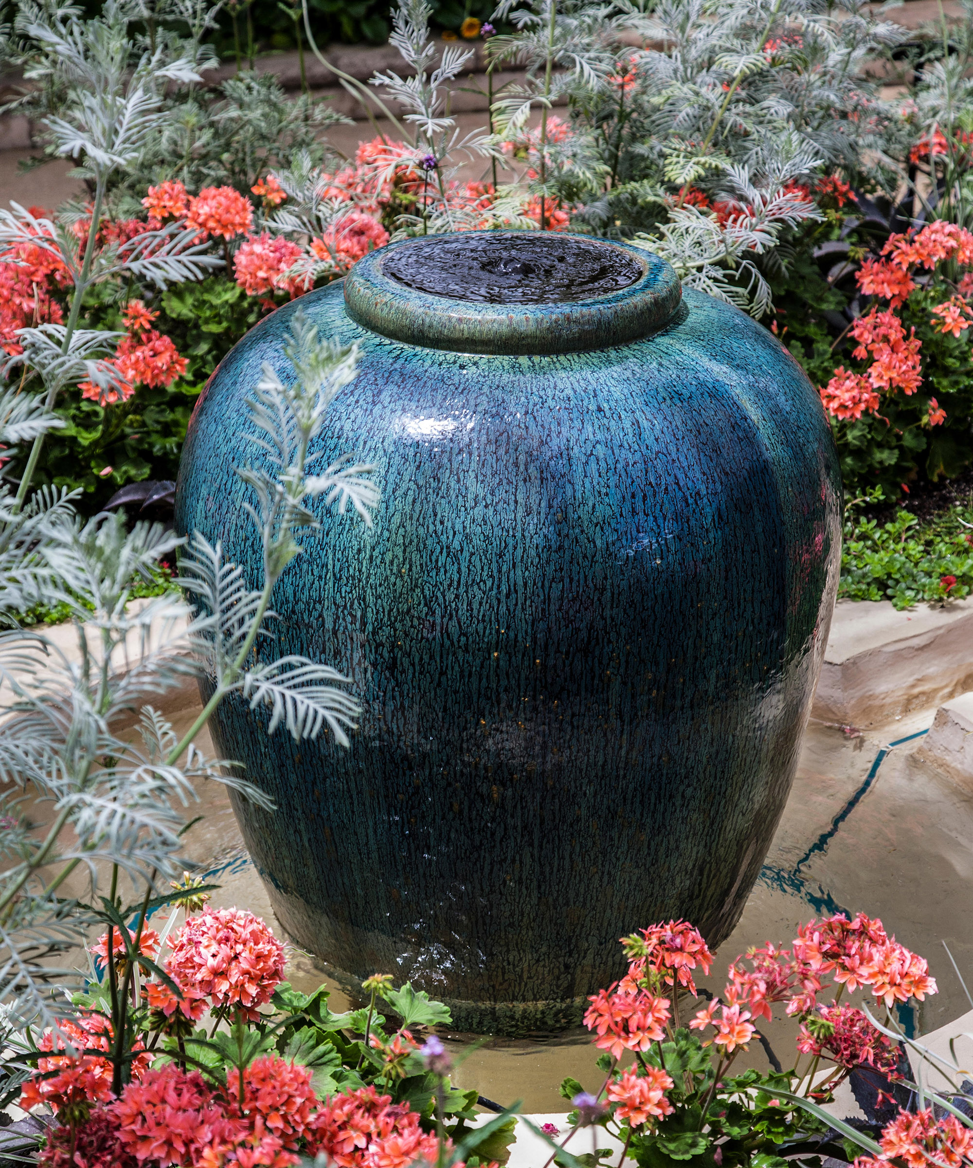 Water often forms a central feature of dry gardens, adding sound and a refreshing atmosphere. Kendall McCumber suggests including a small water feature, such as a bubbling fountain or bird bath idea, which can create the feel of a desert oasis, and uses much less water than an open pond or cascade.