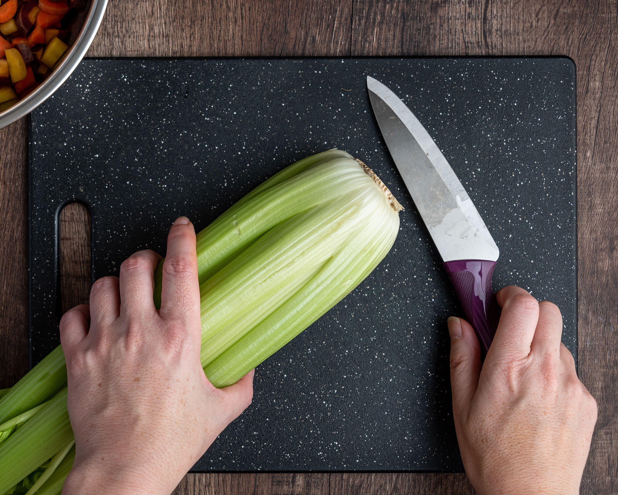 Once you’ve cut the celery stalks from a bunch, you’re left with the bulbous base or stump, the bit you’d normally throw away – this is the part you need for re-growth. It contains the basal plates, where the roots and stem meet, from which new vegetation can grow. A single stalk won't contain the elements needed for growing celery from scraps.