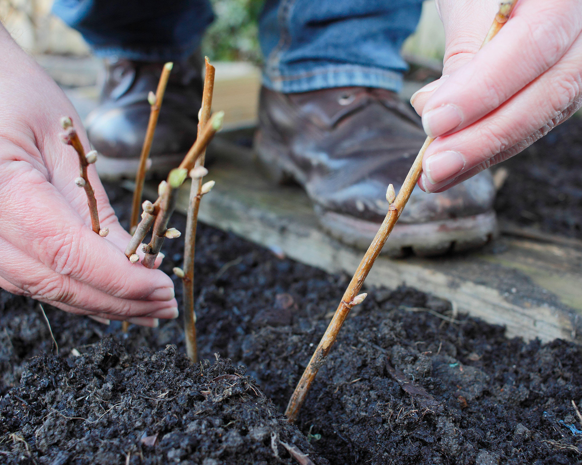 - Insert the cuttings to two-thirds of their depth and tread the soil firm. Roots develop along the stems. Leave them there for a year and re-tread the soil if it cracks and lifts after frosts.