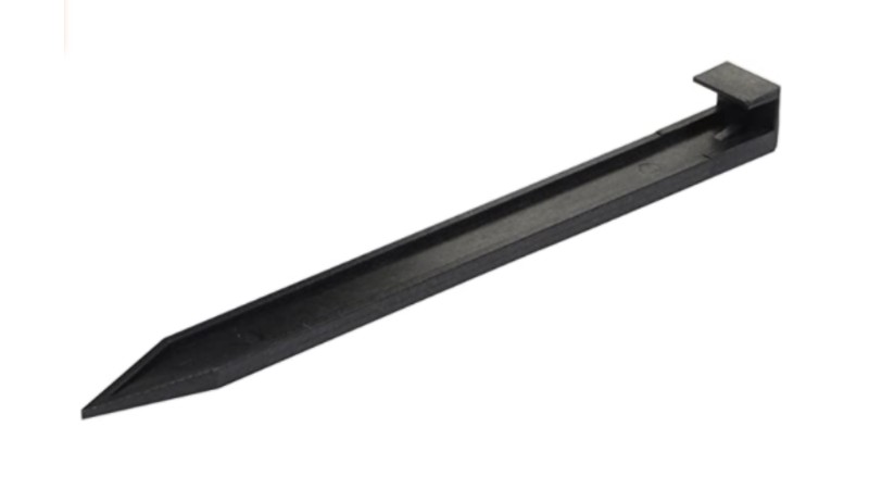 These stakes are made in the USA. They are high-quality and designed to fit easily and snugly into all types of dense and loose soil. The landscaping nails are 8 inches in length and are made from durable plastic that will not rust or crumble.