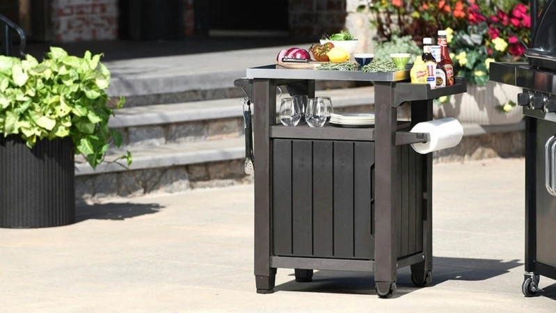 Whether you want a place to prep your veggie kebabs, or for keeping your condiments, this option is for you. The surface has two hutch-style pieces that expand to create double the space. There are four wheels along the bottom, helping you move the cart wherever you need it at a moment's notice. To keep water out, the cabinet doors snap shut, which also prevents items from falling out on the go. The station's surface is very easy to clean.