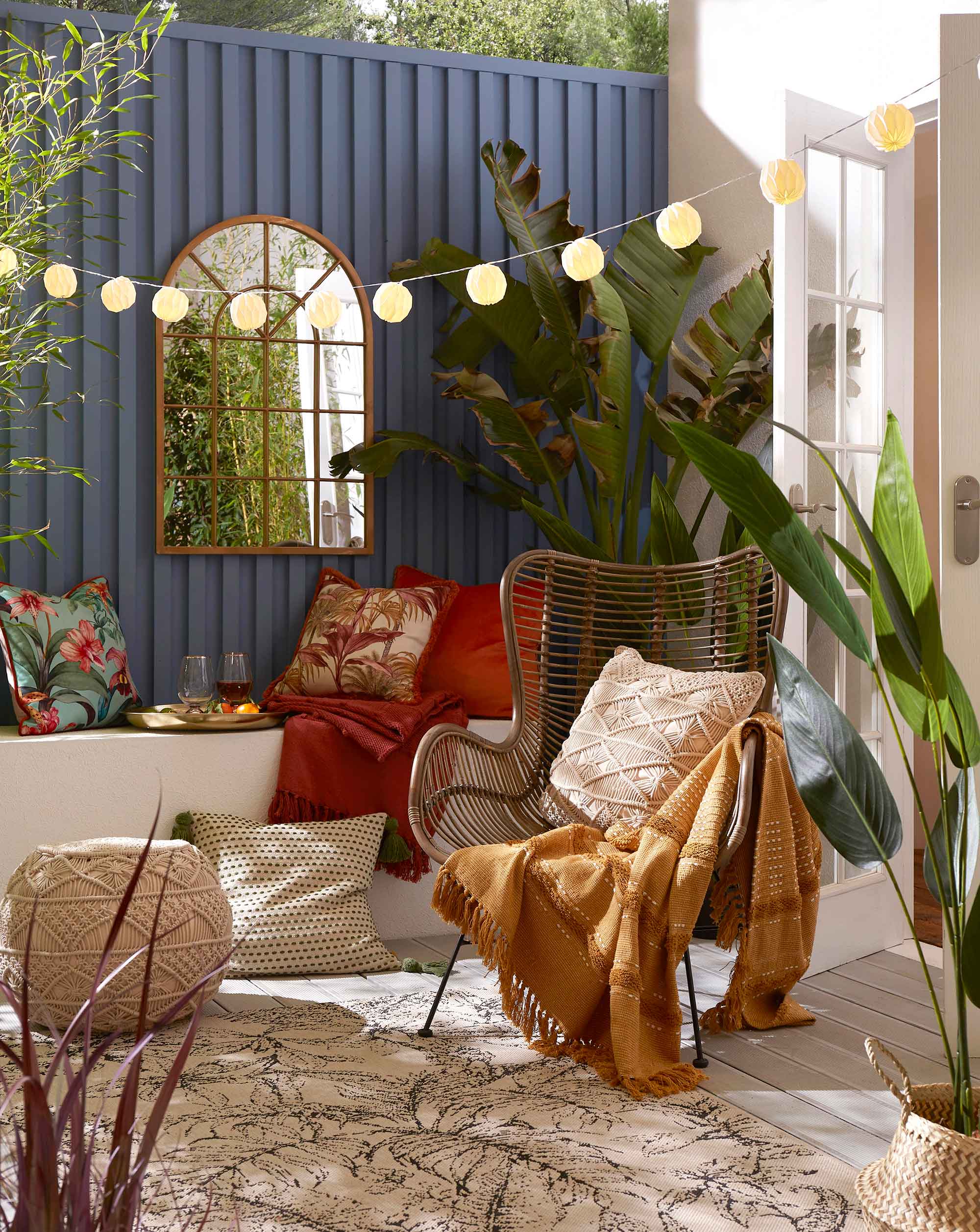 Finish the scene with twinkling festoons, potted plants, and a cozy garden rug underfoot for a low-cost yet high-impact outdoor living space.
