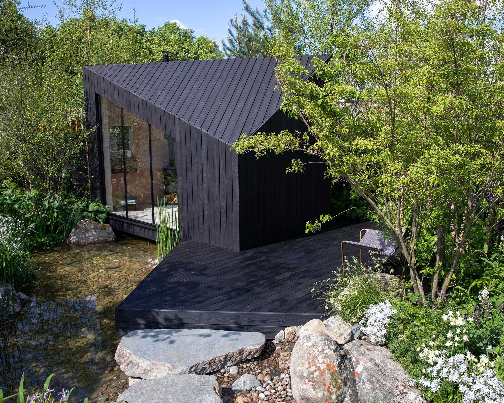 This gorgeous design, spotted at Chelsea Flower Show 2022, features a show-stopping, charred-larch cabin complete with a wood burner – the perfect retreat whatever time of year. The small deck blends seamlessly into the structure with its matching hue, offering a contemporary space for taking in the fresh air and perhaps a spot of yoga.