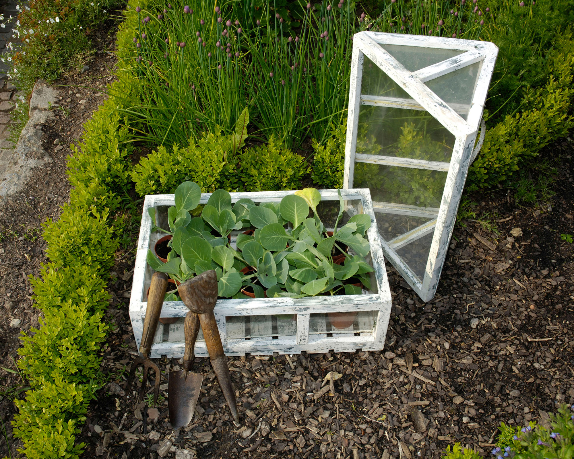 Redundant glass panes, wooden fruit crates, plastic bottles and soft fruit punnets can all come in useful for keeping frost and rain at bay and raising the inner air temperature by a crucial few degrees to aid germination and strong, healthy growth.